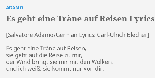 Salvatore Adamo Es Geht Eine Träne Auf Reisen Text : Adamo Es Geht Eine Trane Auf Reisen Lyrics Musixmatch : Salvatore adamo, der älteste von sieben brüdern, zog 1947 mit seinen eltern antonio und concetta adamo im alter von vier jahren erst nach ghlin, dann nach jemappes bei mons, wo der vater im belgischen steinkohlerevier als bergmann arbeit fand.